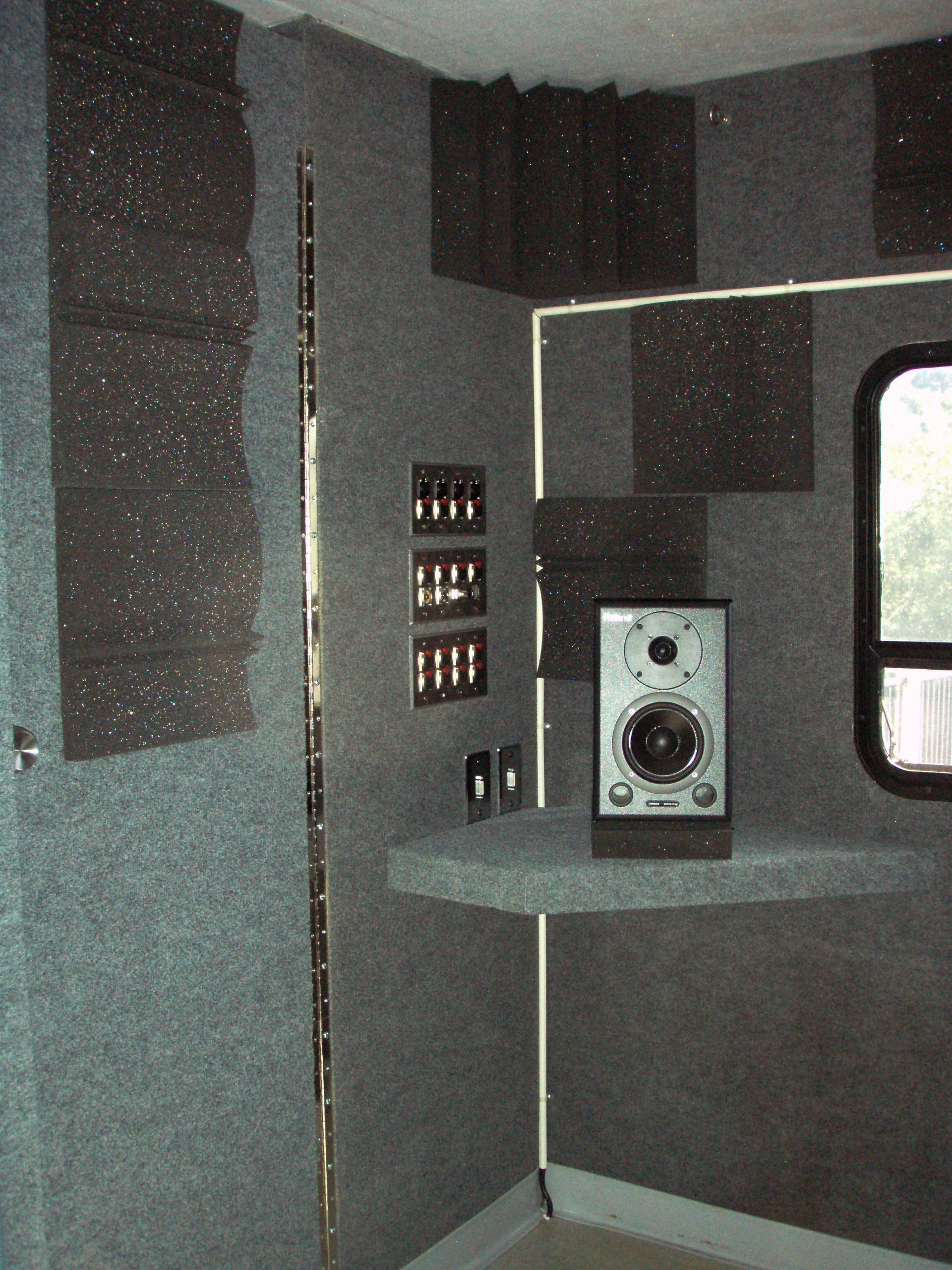 As you can see here, the windows in the front of the house also have carpeted velcro covers that block out light and allow for placement of velcro-backed acoustic foam blocks in the event that the front of house area needed to be used for recording a small band or a large instrument like a drum set.