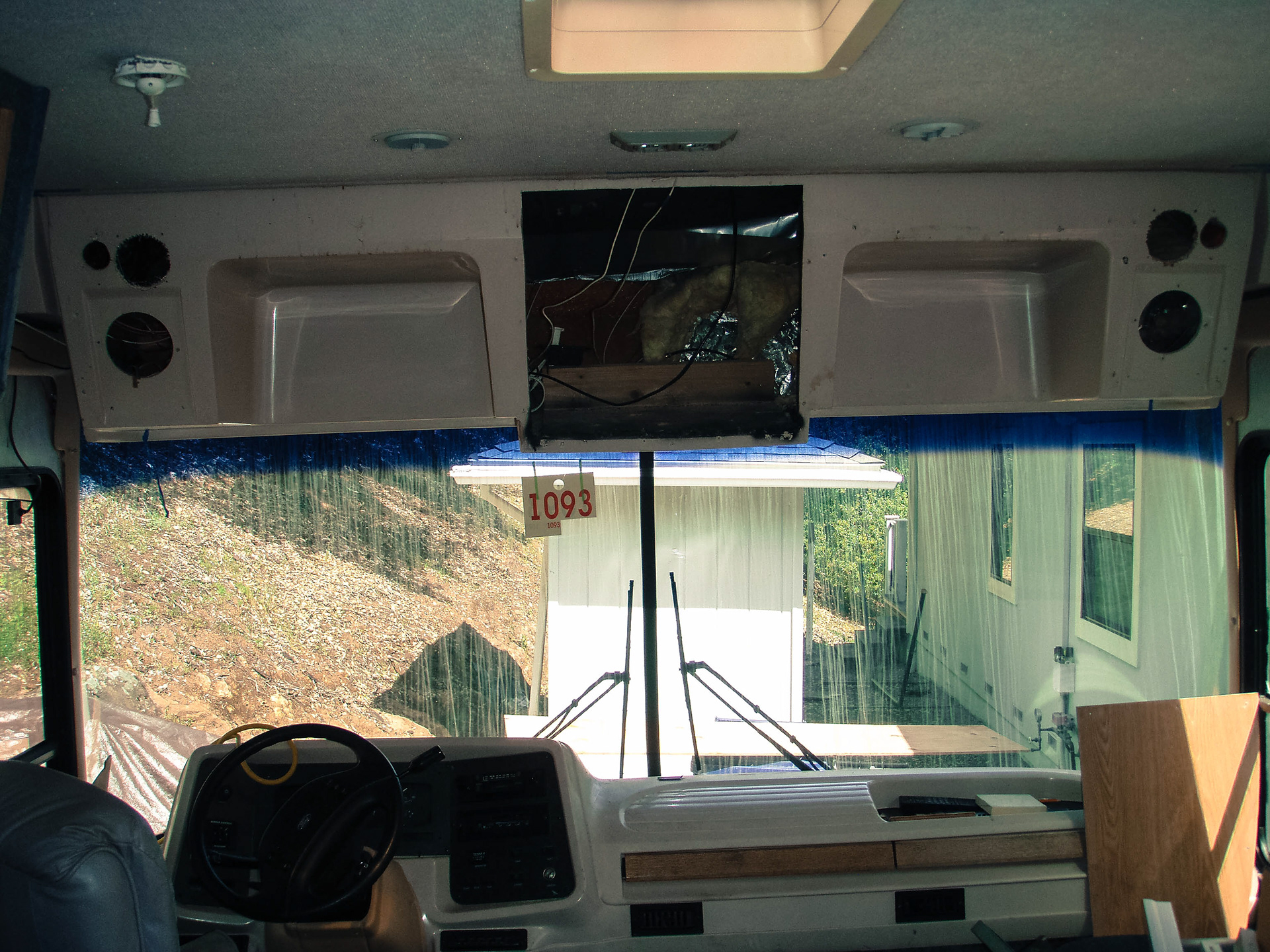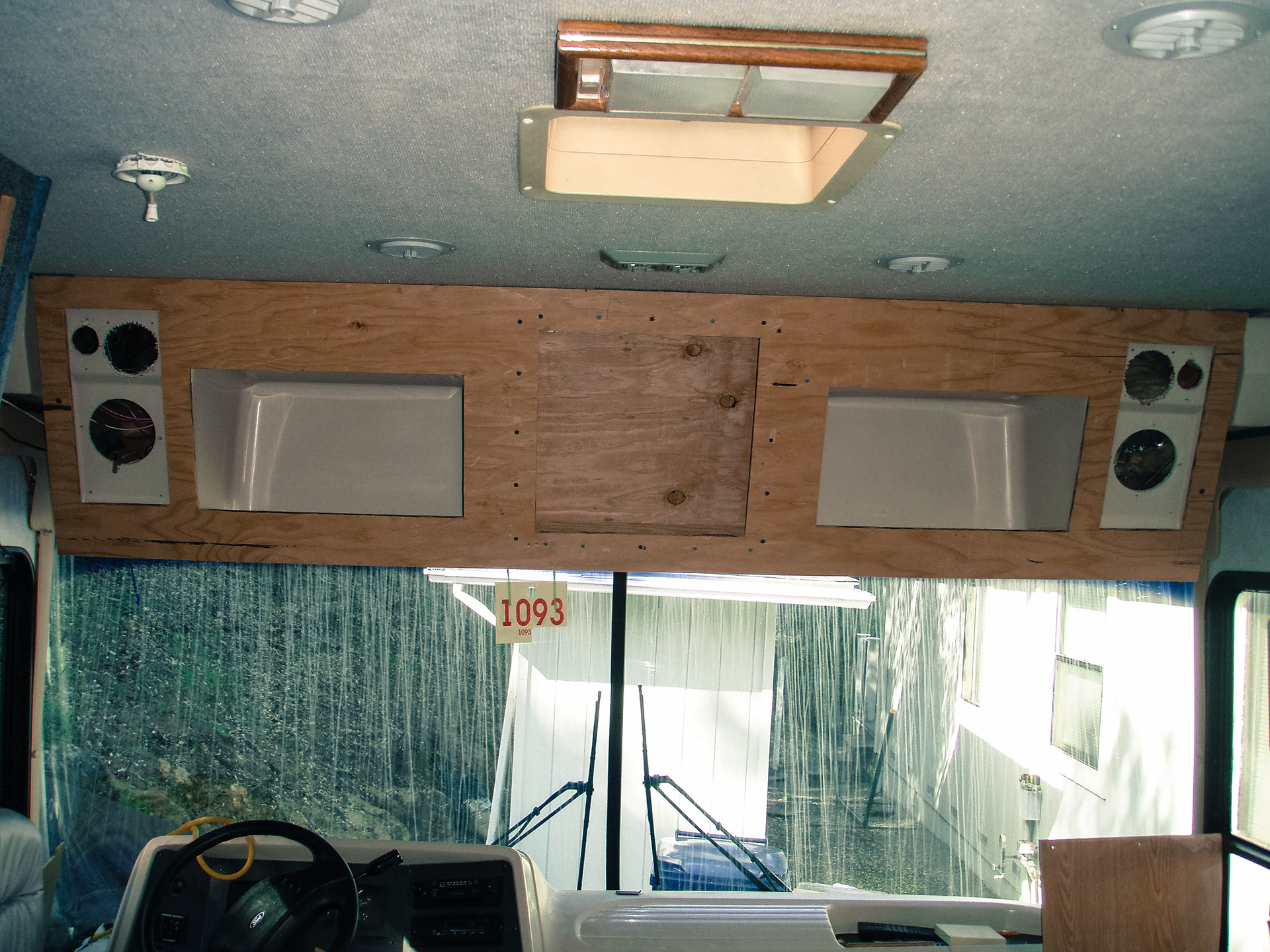 First the overhead dash cupboards needed to have a new face cut from plywood and attached over the fiberglass structure.