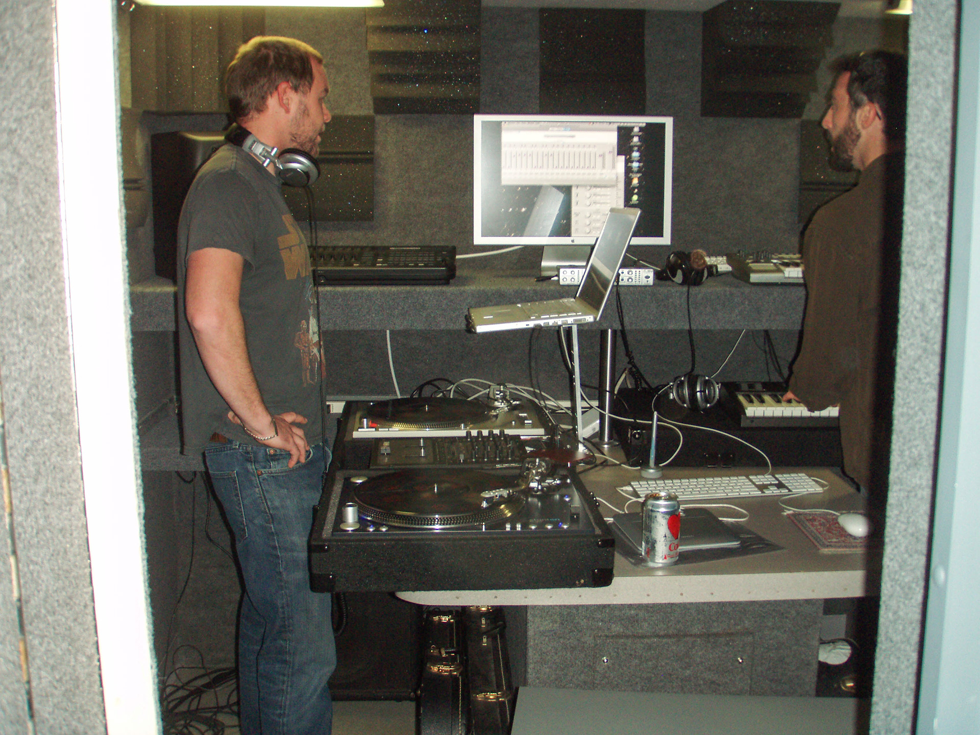 above is roughly the view when when seated at the workstation in the rear booth. This photo was taken during the setup process so the monitors are not in their final position and the center monitor is not present. Today the setup is a 5.1 surround mixing arrangement with the computer screen sitting on the lower desk, a guitar amp on the floor on one side, and a subwoofer on the floor on the other side.