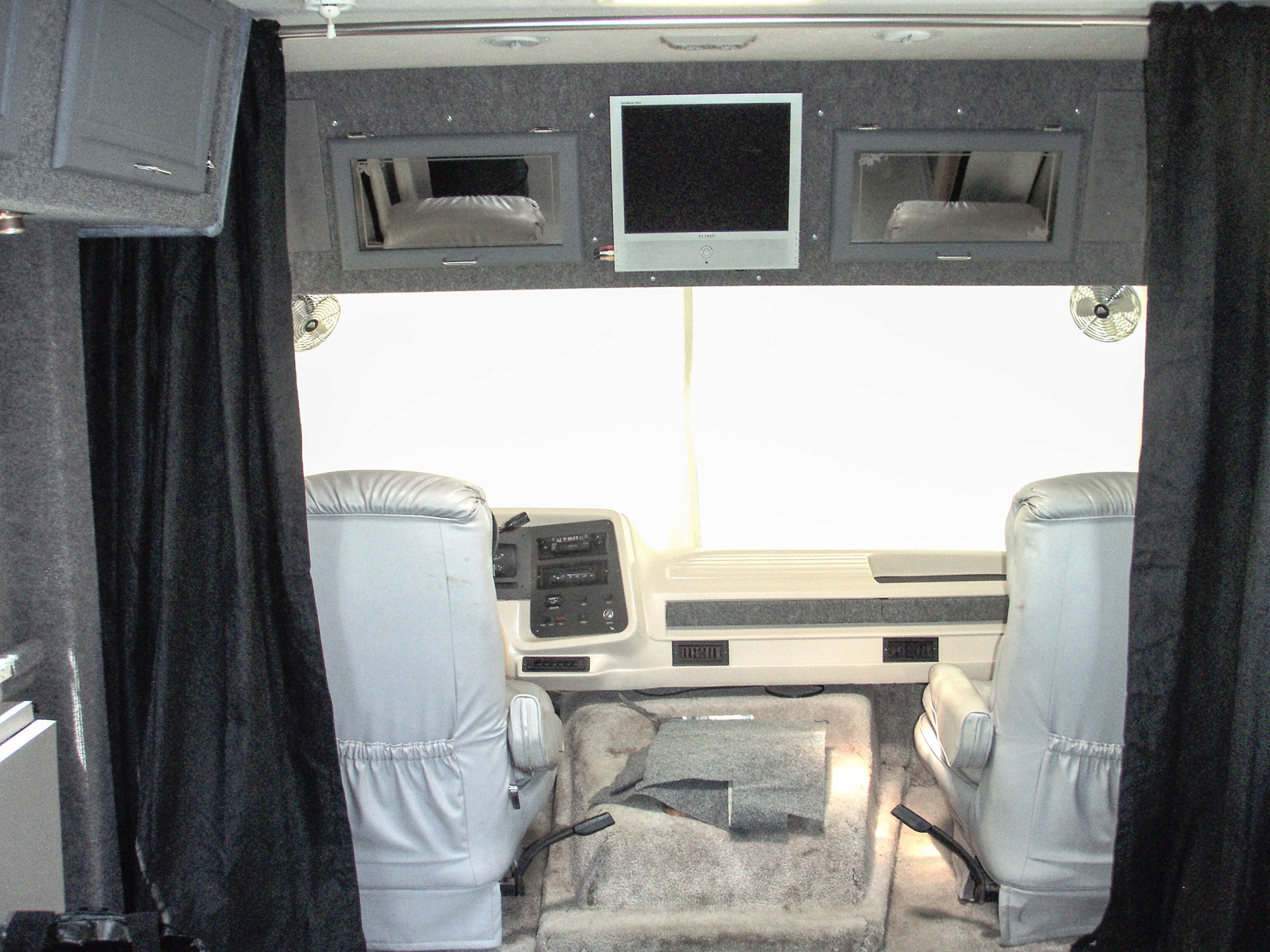 Extra carpet trim was added to the dashboard in order to maintain a sense of aesthetic consistency. The curtain rod and blackout curtains were added as a finishing touch which can be closed when the studio is parked in order to virtually eliminate the impression of being in a vehicle.